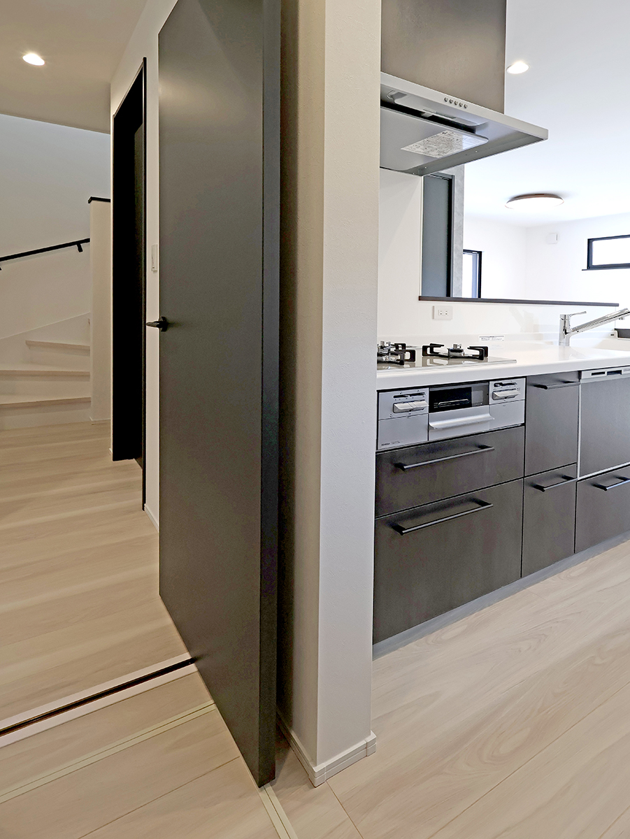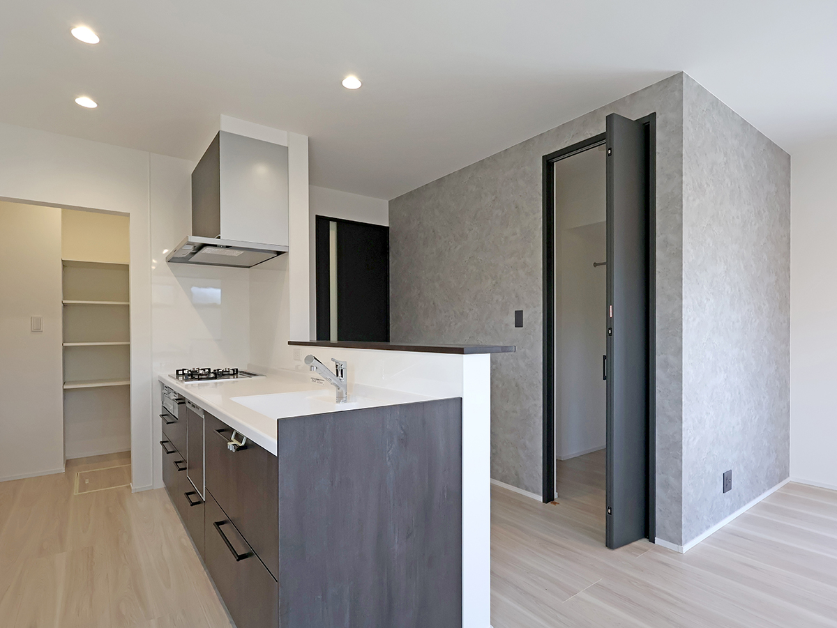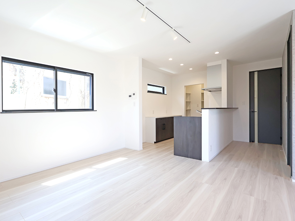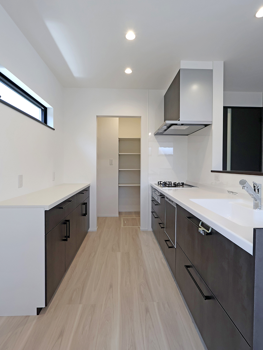 18帖LDKはキッチンに立ちながらも家族に目が届きやすいしやすい配置で、横に設けたパントリーから水廻り、玄関につながるので家事ラク&生活動線もスムーズな間取りです!