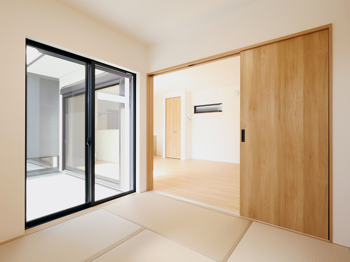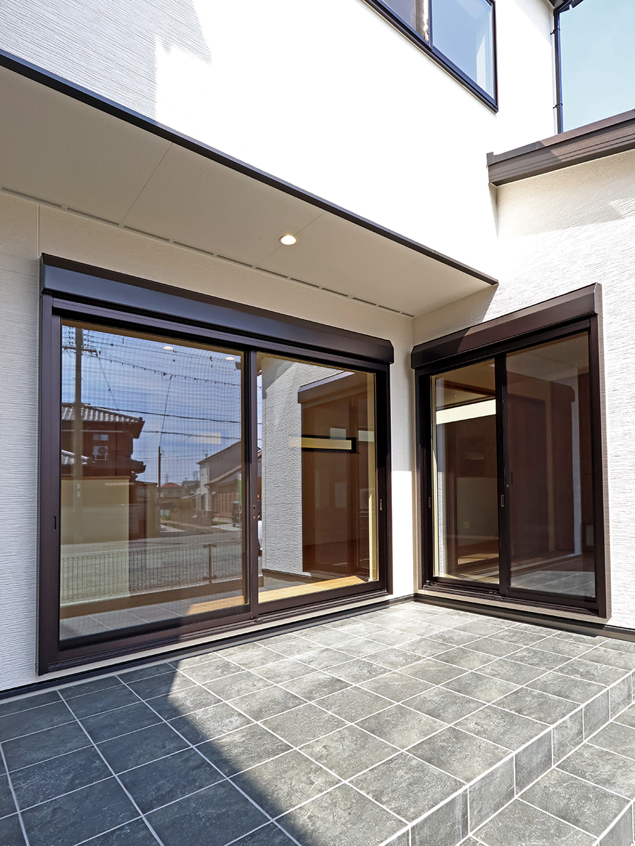 タイル敷きの中庭はガーデニングやお子さんの遊び場などにリビングとソトをつなぐ寛ぎ空間♪