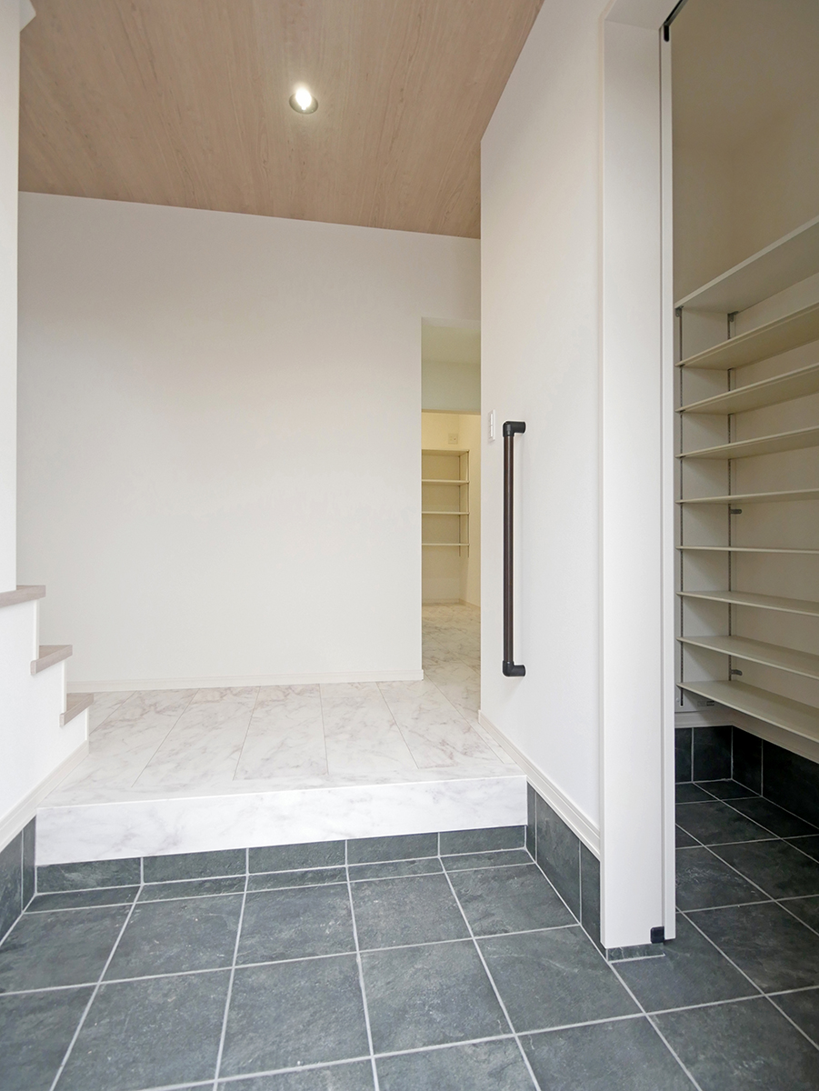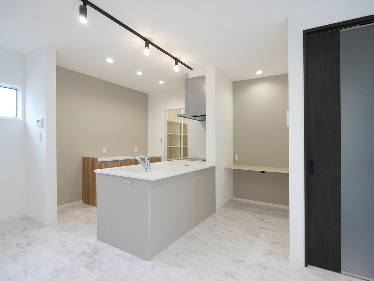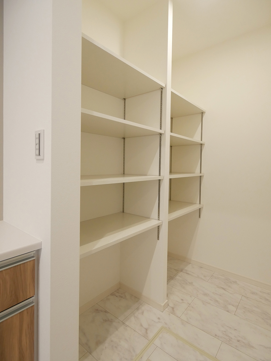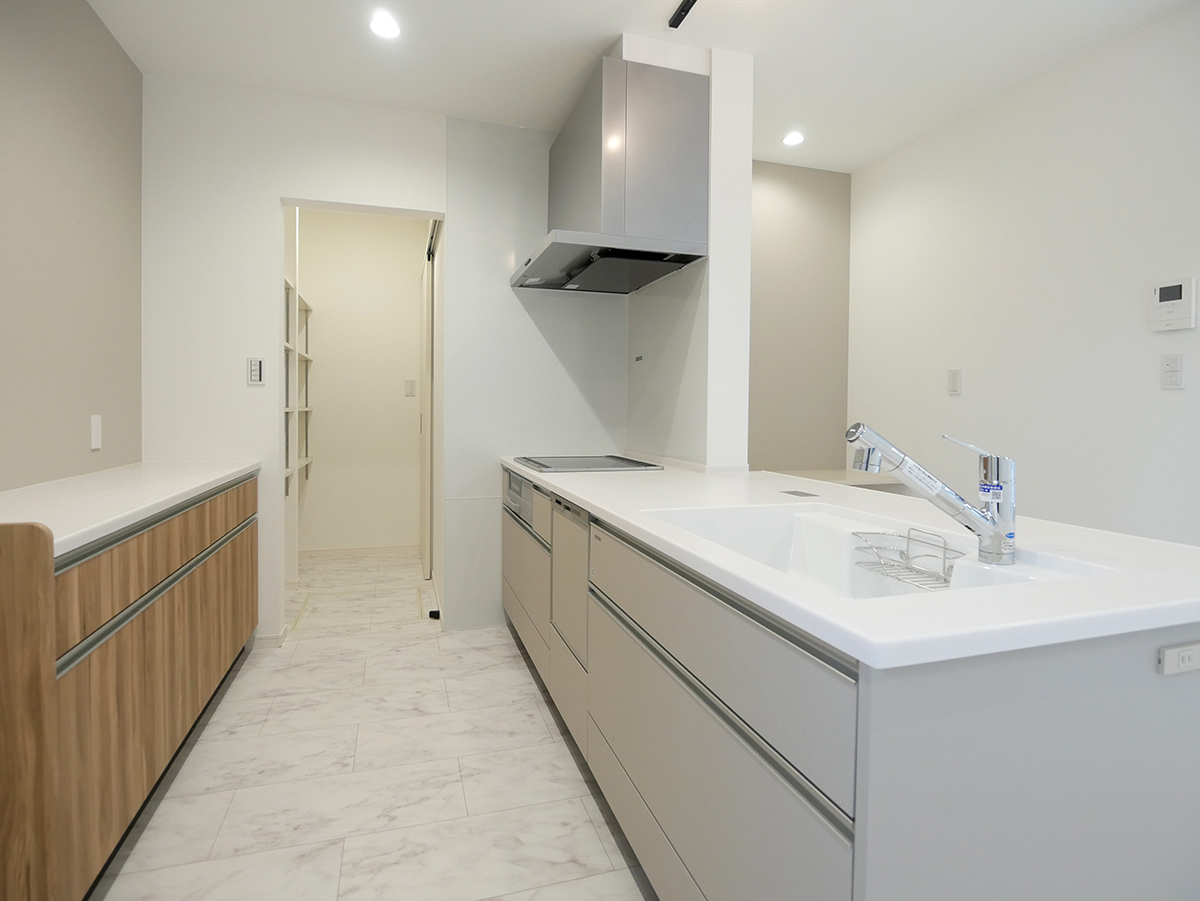 家族が集いやすいLDKは、キッチンからパントリー&ファミリークローゼットを介して回遊できる生活動線スムーズな間取り。2階の蔵や適量適所に設けた収納も嬉しい住まいです。