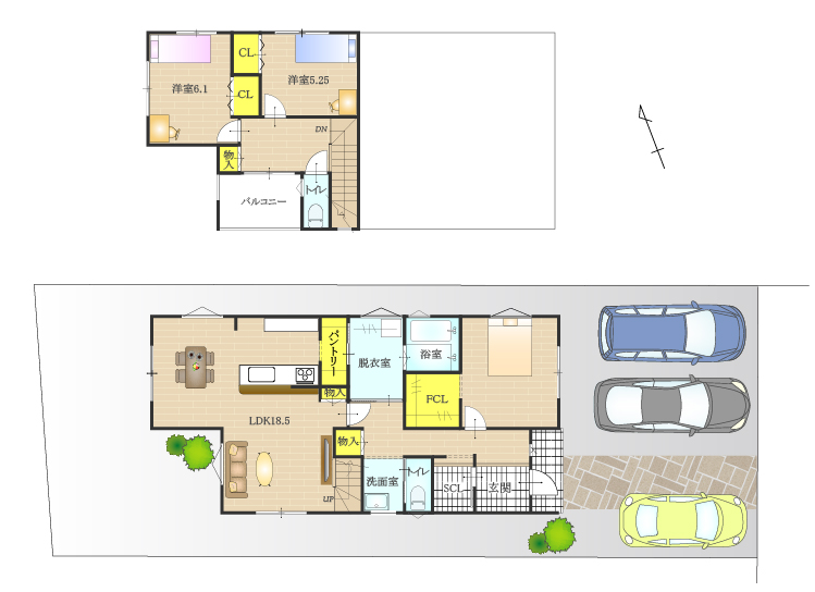 自然豊かな周辺環境の全6区画分譲地内。土地面積、広々約61坪で駐車3台可能な建売モデルです。