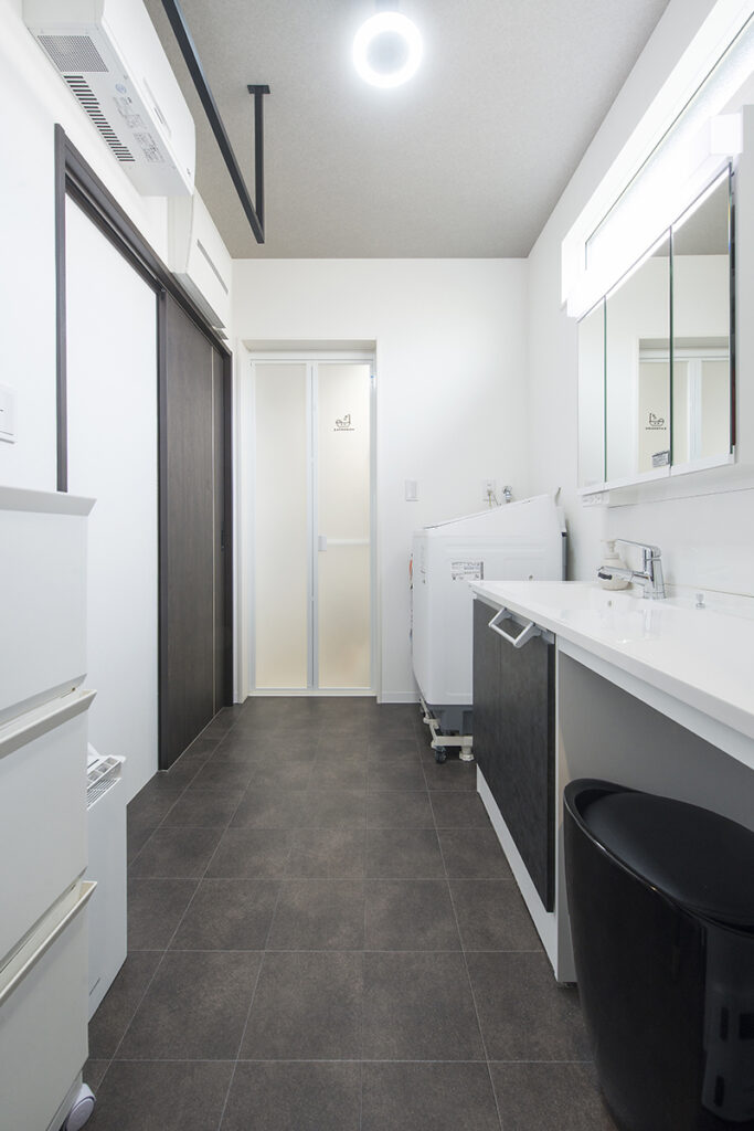 洗面室兼ランドリールームになっていて、花粉症があるので、洗濯物も完全に室内干しでここに干しています。